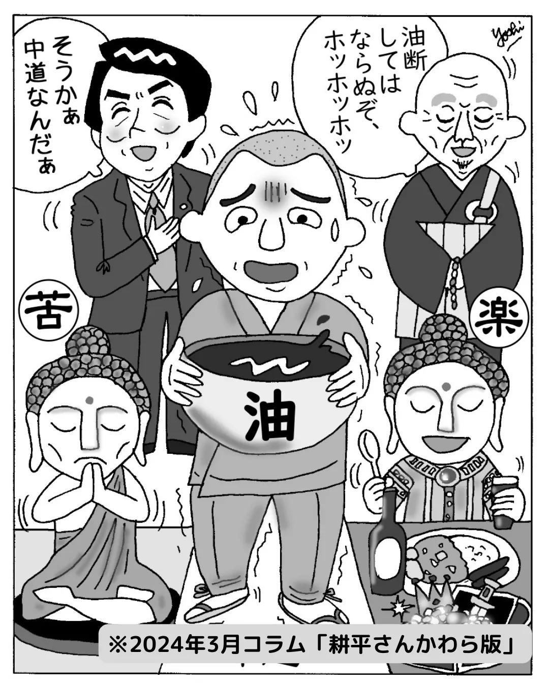 「涅槃経」というお経に「油断」の語源となる逸話が語られています。その昔、インドの乱暴な王様が臣下に油を一杯に注いだ鉢を持たせ「もし鉢を傾けて一滴でも油をこぼしたら命を断つ」と命じました。物騒な話ですが、「油をこぼしたら命を断たれてしまう」というくらいの緊張感、真剣さをもって修行しなさいという教えです。