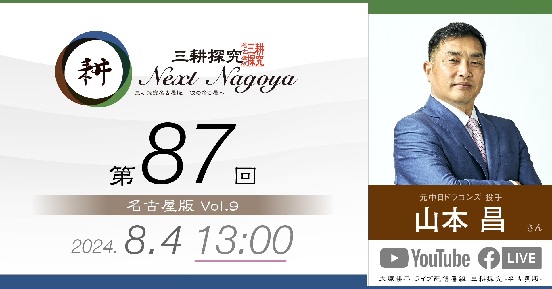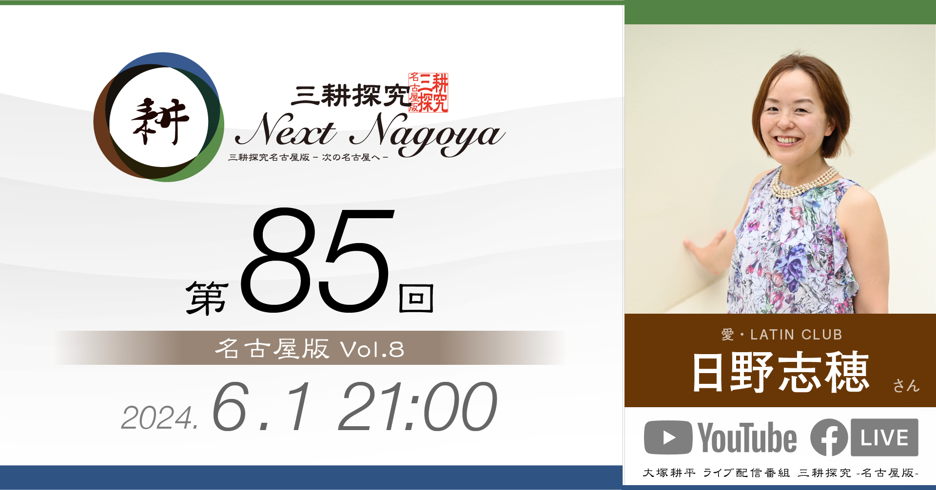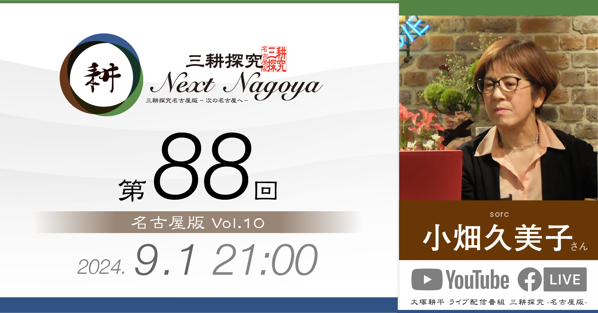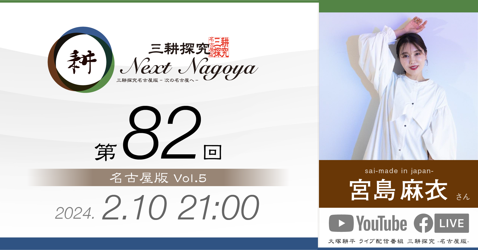 三耕探究(ライブ配信) 日々の活動の中でご縁をいただいた方との対談をライブ配信にてお届けしております。本ページは過去の配信のバックナンバーです。 【第88回】sorc小畑久美子さん 人気LPレコード店「sorc」の小畑久美子さんです… 視聴する » 【第87回】元中日ドラゴンズ投手山本昌さん 今回は元中日ドラゴンズ投手山本昌さんをゲストにお招… 視聴する » 【第86回】元アサヒビール「シルバースター」木村俊作さん 今回は東京からお送りしました。元アサヒビール「シル… 視聴する » 【第85回】愛・LATIN CLUB 日野志穂さん 「愛・LATIN CLUB」会長の日野志穂さんをお… 視聴する » 【第84回】ファイナンシャルプランナー 徳田恵理さん 4月27日(土)21時に配信しました。 今回のゲス… 視聴する » 【第83回】大学生 田中芳宙さん 3月24日(日)21時に配信しました。 今回のゲス… 視聴する » 【第82回】sai-made in japan 宮島麻衣さん 今回のゲストは宮島麻衣さん。 ママ友2人でオリジナ… 視聴する » 【第81回】(株)リズメリット有吉祐恵さん 第81回は「名古屋版」の 第4回目としてお送りしま… 視聴する » 【第80回】間瀬理右樹さん 10月29日(日)21時から配信しました。 第80… 視聴する » 【第79回】間瀬理右樹さん 9月23日(土)21時から配信しました。 第79回… 視聴する » 【第78回】ちくさこども食堂 伊藤正巳さん 今回は「こども食堂」についてお伝えします。 「ちく… 視聴する » 【第77回】べんてんや スージーさん 今回のゲストは2回目の登場となる「べんてんや」のス… 視聴する » 1 2 3 4